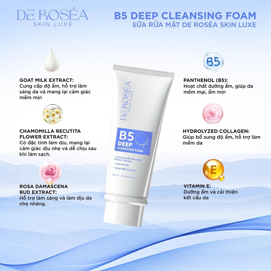 - Sữa Rửa Mặt Dưỡng Ẩm B5 DEEP DE ROSEA giúp làm sạch sâu, dưỡng ẩm và hỗ trợ ngăn ngừa mụn hiệu quả. Kết cấu bọt mềm mịn nhẹ nhàng loại bỏ bụi bẩn, bã nhờn mà không gây khô căng da. Mang lại cảm giác tươi mát, dễ chịu và cho làn da luôn thoáng sạch mỗi ngày.